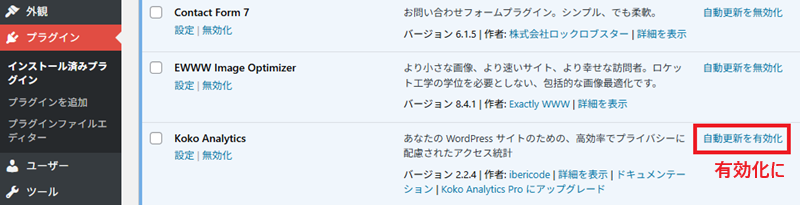 ついでに。インストール済プラグインを開き、『自動更新を有効化』しておきましょう。