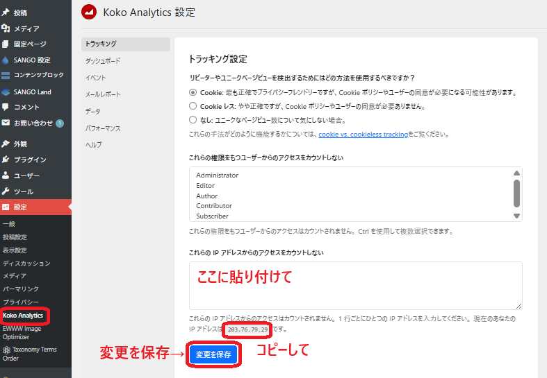 トラッキング設定を見れば、自分のIPアドレスが表示されているので、これをコピーしてカウントしない枠に貼り付けて、『変更を保存』をクリック!