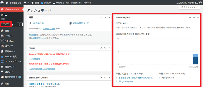 ダッシュボードに表示されてますが、ダッシュボードの中に『Analytics』が追加されているので、ここでも見ることができます。