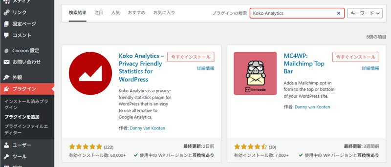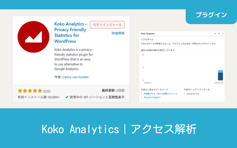 知りたいことは、毎日のアクセス数と、どのページが見られているか?ってことぐらいなので、細かく分析できるものは必要ないと考えて、シンプルなアクセス解析プラグインの『Koko Analytics』を使ってみることにしました。
