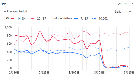 3月9日からアクセス数がガタっと減り、10日はゼロになり、その後は数十のアクセス数。