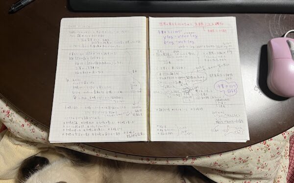 で。家にあった使いかけのA5方眼ノートを見開きで使うことにして、ずっと脳内にあって、まとまってない思考をルールに沿って書き出してみたりして。