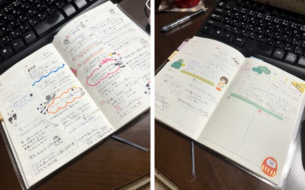 「手書きログを書くぞ!」となってからは、↓こんな感じ↓に可愛いシールや色ペンを使って気分を上げて、その日その日をまとめていけるようになってきました。