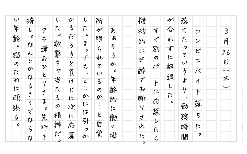 まっ仕方ない。次だ次!と思って、まったく違う業態に応募してみたら、1時間も経たない間に、機械的に年齢でお断りされた。そっか、58歳は足切りされる年齢なのか…年齢的に働く場所が限られてきているんだ…と自覚した。