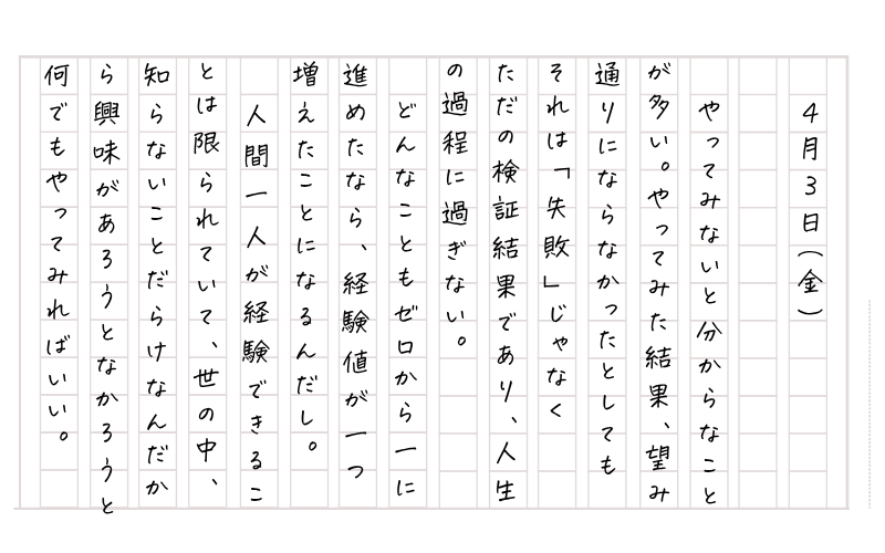 やってみないと分からないことは多々あって。やってみた結果が望み通りにならずに「失敗」だったとしても、この「失敗」は過程にしかすぎないんだから、実のところは「検証結果」でしかないんだよね。