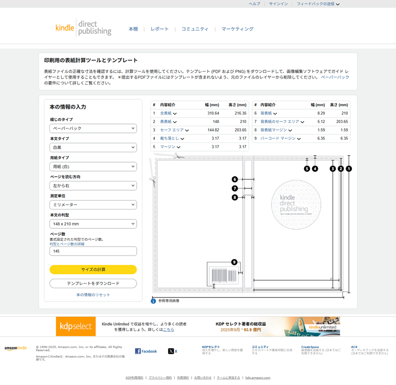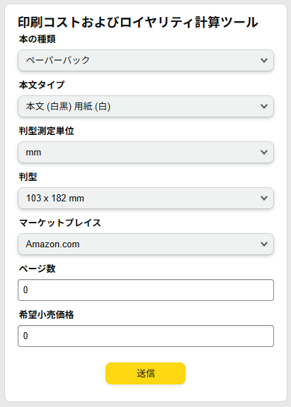 ペーパーブックの場合、印刷コストがかかるので、それらを考慮して価格を決める必要があります。印刷コストおよびロイヤリティの計算は、↓このページ↓で計算できます。