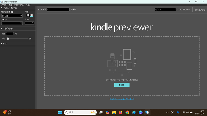 - Kindle Previewer にkdf形式のデータをアップし、プレビューして確認。